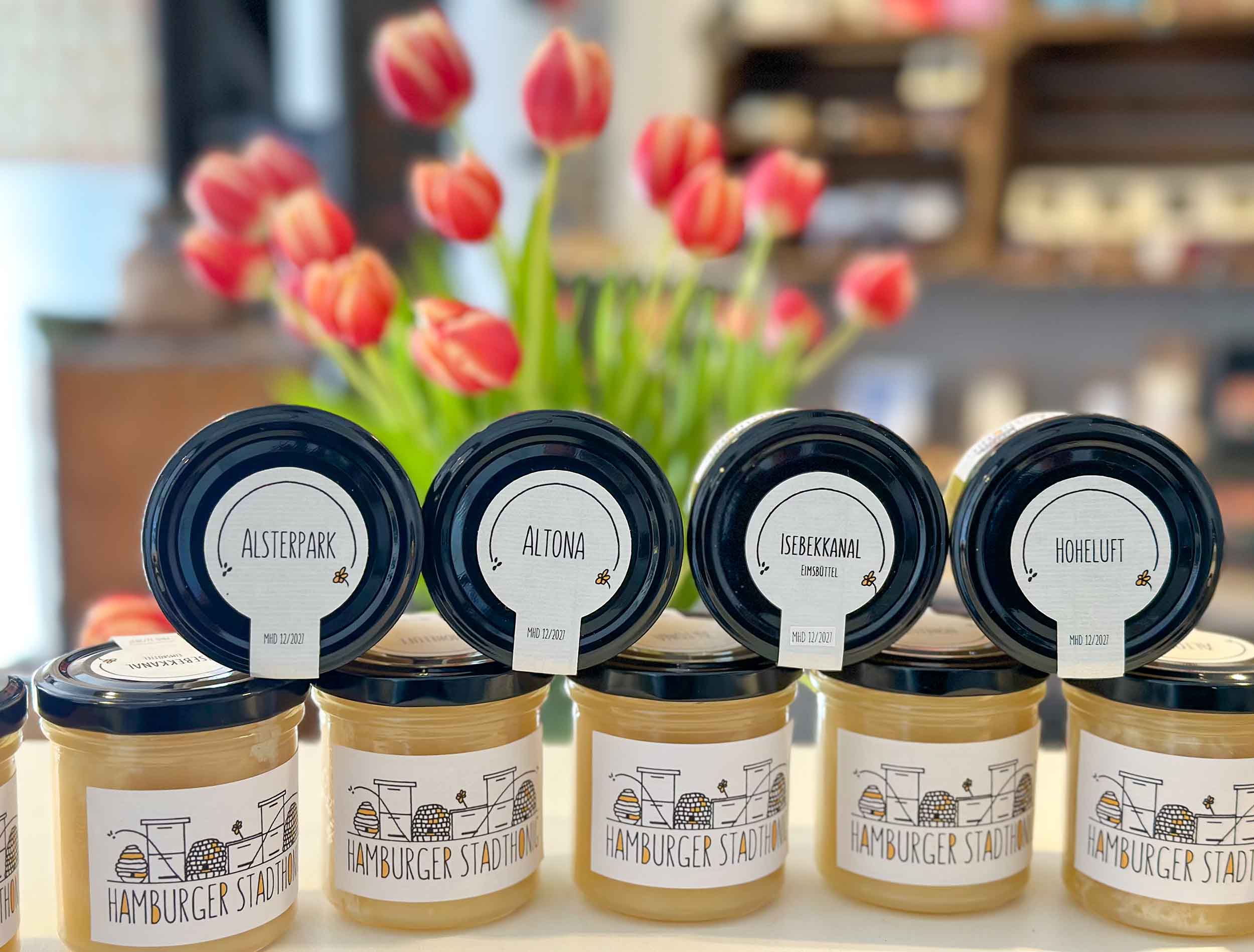 Leckereien aus der Flora von Hamburgs Parks, Auen und Flussufern. Gesammelt von fröhlich summenden, fleißigen Bienen.