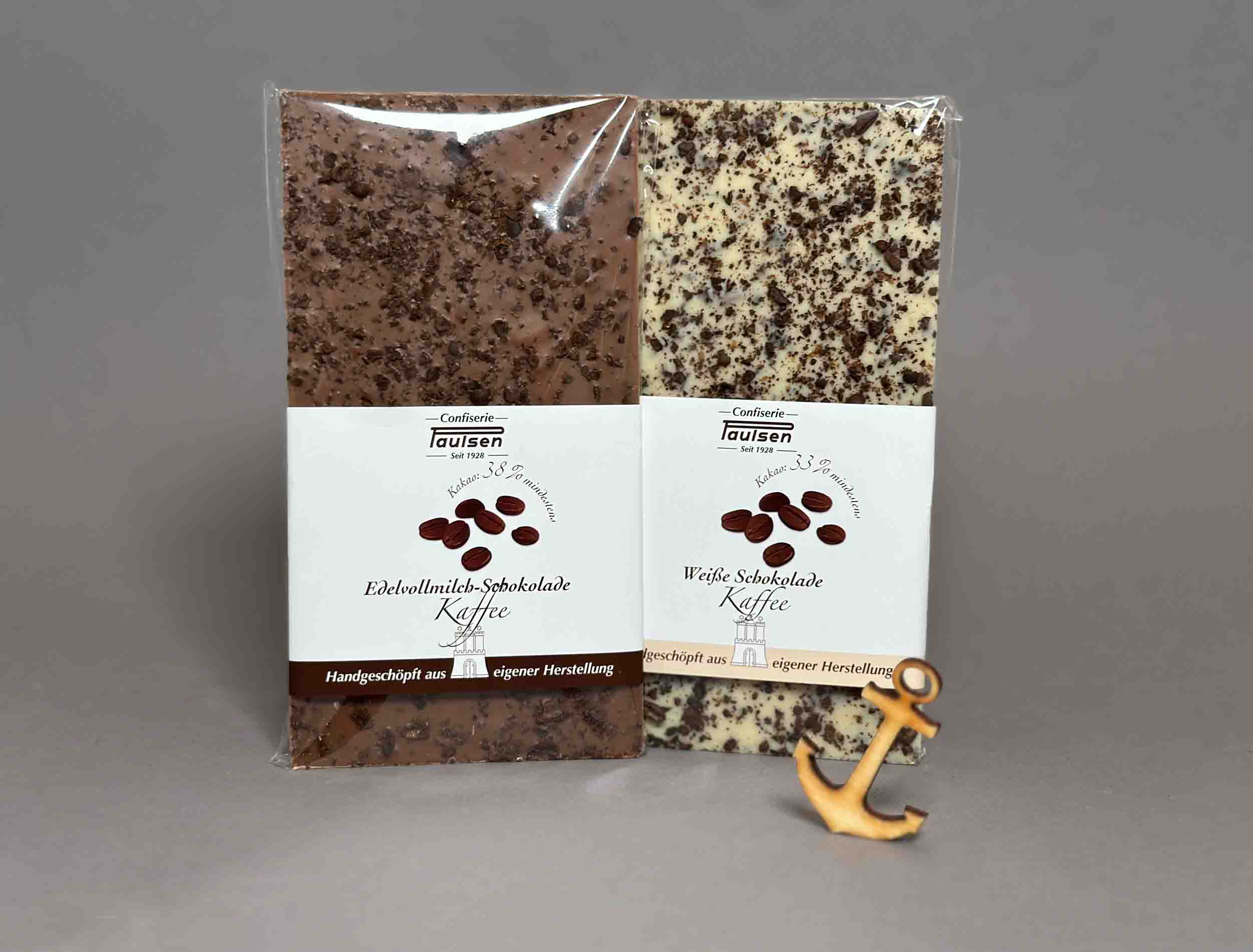 Kaffeeschokolade in Vollmilch und weißer Variation verfeinert mit Kaffeenibs.